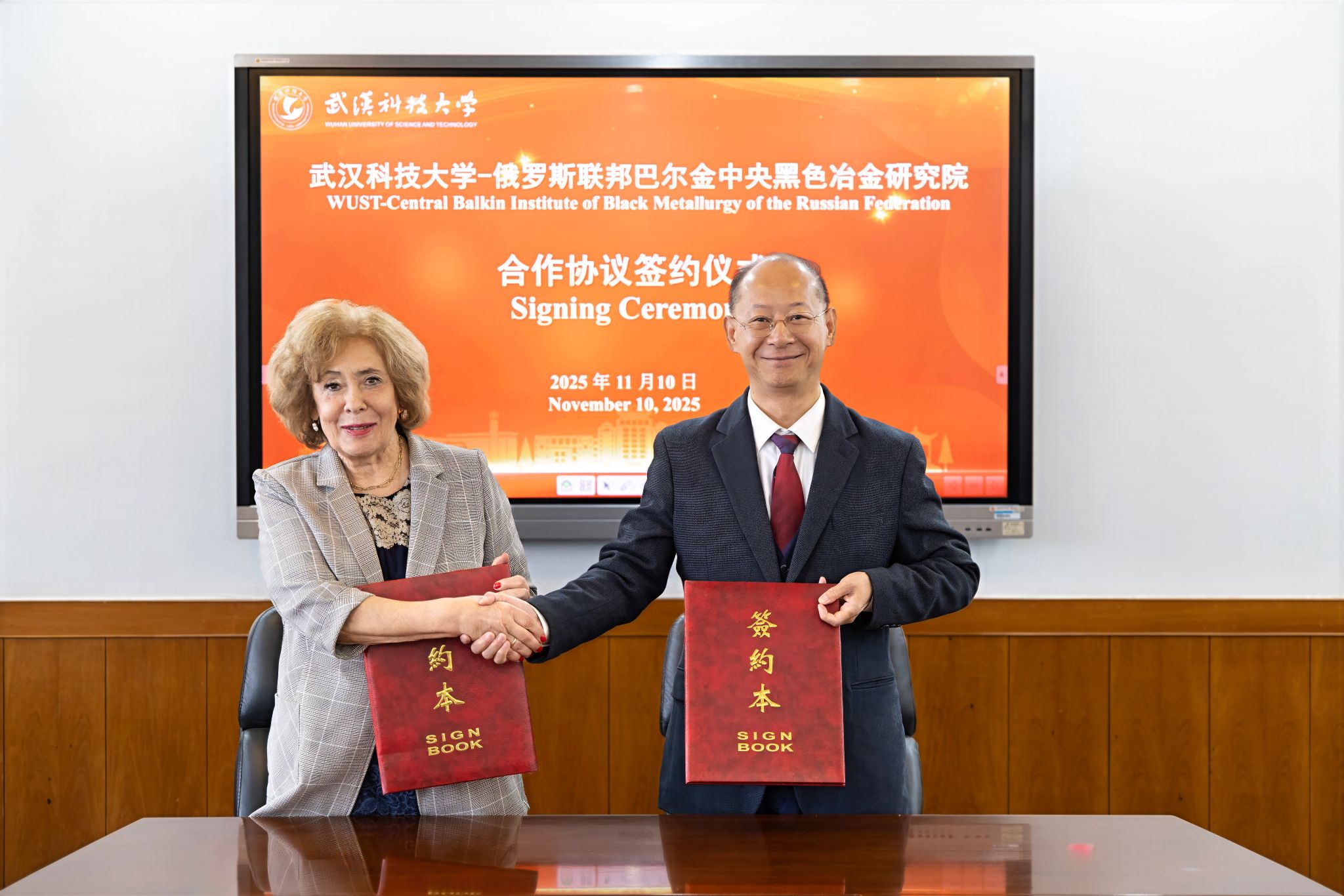 在与会嘉宾的共同见证下,我校高性能钢铁材料及其应用省部共建协同创新中心常务副主任吴开明与伊丽娜·罗迪奥诺娃教授分别代表双方签署合作协议。根据协议内容,双方将建立长期合作伙伴关系,致力于在创新产品与技术研发及应用领域开展深度科技合作。