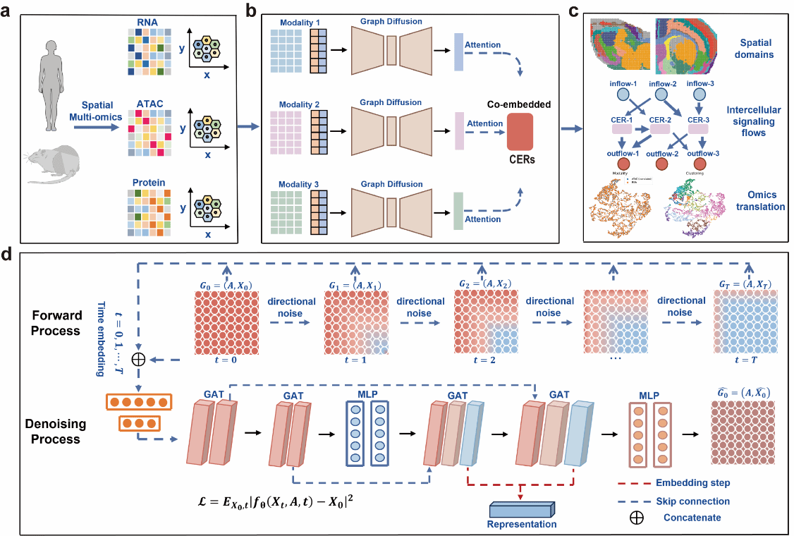 研究团队提出了一种基于有向扩散模型的空间多组学整合框架 SpaDDM(图1)。针对空间多组学中的各向异性特征,SpaDDM 引入数据依赖的方向性噪声建模,增强对组织结构与空间边界的刻画能力,提升区域分割精度与稳定性。模型以空间感知的共嵌入低维表征CERs为媒介,整合多组学信息,结合 COMMOT CellChatDB 推断配体—受体作用,并整合 GLUE snapATAC2 鉴定关键转录因子,构建“流入信号→CER→转录因子→流出信号”的多层级信号网络,实现细胞通讯的多组学整合解析。