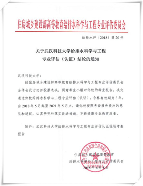 (通讯员 曾琦 杨曌)近日,住房城乡建设部高等教育给排水科学与工程专业评估委员会发文(给排水评[2018]第20号),通过了我校给排水科学与工程专业的评估认证,合格有效期为3年,自2018年5月起至2021年5月止。我校成为今年全国唯一一所初评通过给排水科学与工程专业评估认证的单位。