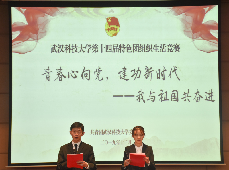 武科大网讯(通讯员顿文妍 见习记者廖雅贇 摄影魏千玉 蔡雨露)为热烈庆祝中华人民共和国成立70周年,11月2日晚,我校在崇实会堂成功举办“青春心向党,建功新时代”第十四届特色团组织生活竞赛。莅临现场的嘉宾有校团委书记潘丽莎、团委副书记张晶、党委学生工作部李鲤、团委组织宣传部部长周习海、团委副书记吕权、团委副书记谭武全,以及第十三届特团一等奖获得者潘杨。