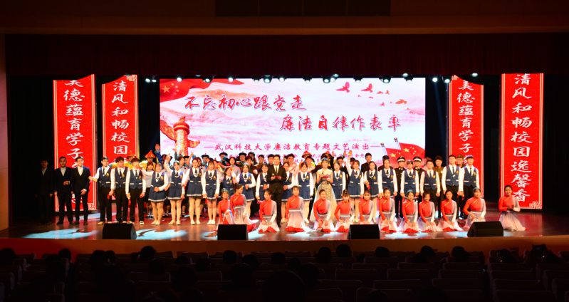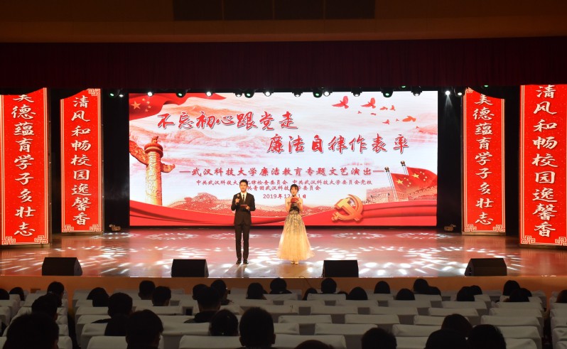 武科大网讯(通讯员谭垚 见习记者周滢滢 摄影孙鸿宇 蔡阳可 顿文妍)12月1日下午,我校在千人大礼堂成功举办“不忘初心跟党走 廉洁自律作表率”廉洁教育专题文艺演出。党委宣传部常务副部长孔波,校团委副书记王媛媛,党委宣传部孟颖及我校预备党员、青马班学员、2019级新生团支书到场观看了本次演出。