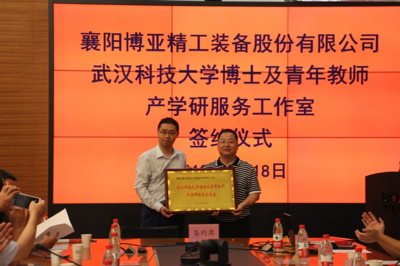 为响应国家关于加强学校与企业产学研相结合的号召,充分发挥学校与企业双方优势及高等教育,更好的为社会、为企业培养高素质高技能的应用型人才,同时也为大学生实习、实训、就业提供更多空间。王蕾老师作为湖北省第八批“博士服务团”成员,在服务博亚公司期间,积极推动博亚公司与我校的产学研合作,在两家单位的共同努力以及襄州区科学技术研究院的大力支持下,成立了武汉科技大学机械自动化学院博士及青年教师与襄阳博亚精工股份有限公司产学研服务工作室。