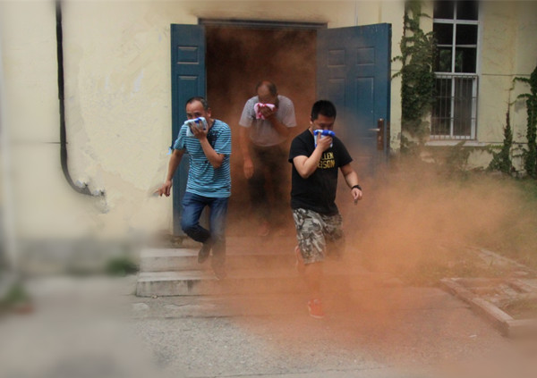保卫处组织参训人员在聚怡餐厅职工宿舍进行疏散逃生演习。模拟火情出现后,楼道冒出滚滚浓烟,工作人员根据课堂学到的逃生要领,分别从楼道两侧楼梯撤离,弯腰低姿、湿毛巾捂住口鼻,迅速有序地撤离到学校操场安全区域。