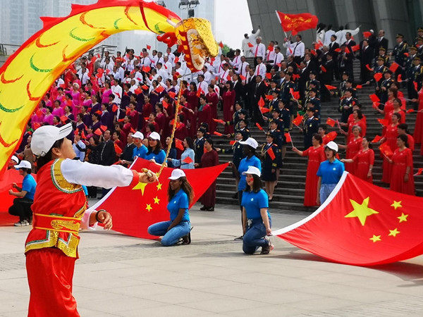 上午10点,大家一同前往首义广场,环绕着广场的雕塑,挥动着手中的国旗,歌唱《追梦》,给现场的观众们带来了绝佳的视觉听觉盛宴,嘹亮又充满生命力的歌声激起了一阵阵的掌声。