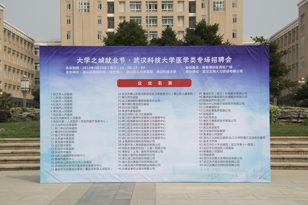 武科大网讯(见习记者王梦瑶 记者赵泽颖 摄影朱可嫣)4月24日下午,由洪山区组织部、洪山区人力资源局与我校共同主办的医学类专场招聘会在黄家湖校区杏坛广场举行。来自全国各地的近八十余家企业参与招聘,为毕业生提供了一千多个就业岗位。