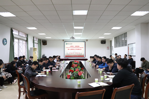 武科大网讯 (通讯员涂虎 朱艺 朱可嫣) 4月2日下午,我校第十九期学生工作创新论坛在黄家湖校区教四楼41401会议室举行,党委宣传部常务副部长孔波,党委教师工作部部长、人事处处长傅江浩,学生工作处处长刘抗强,副处长鞠磊,文法与经济学院党委副书记潘婧出席会议。鞠磊主持会议。