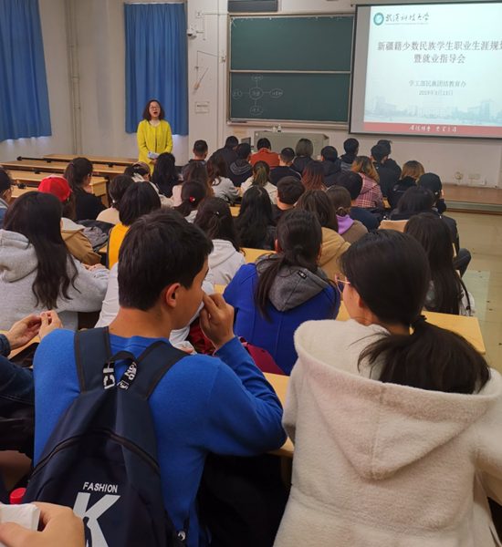 武科大网讯(通讯员玛依努尔 摄影玉散)3月13日,民族团结教育办组织召开新疆籍少数民族学生专场职业生涯规划暨就业指导培训会,全校新疆籍少数民族师生参加会议。