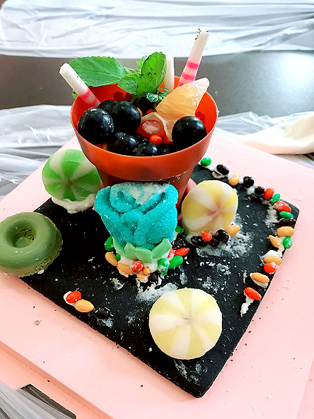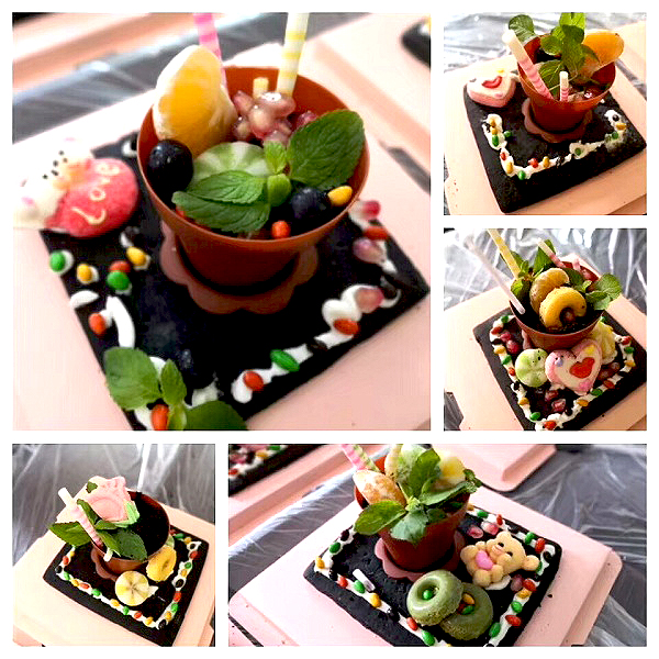 前台摆放了蛋糕底、鱼胶片、淡奶油、芝士、巧克力碎、时令水果、薄荷叶、饼干底座等等,琳琅满目。我们用慕斯来做盆栽,盆栽也是可以吃的。