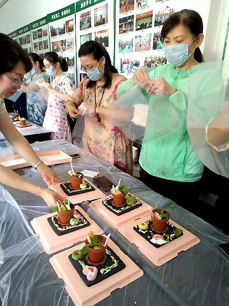 本次活动邀请到武汉神东蓝美文化传播有限公司职员王丹担任烘焙培训师。在培训师的指导下,一步一步,按照流程,老师们全心投入,精心制作。一个多小时过去了,一盆盆形态各异、色香味美的慕斯盆栽呈现在大家眼前。