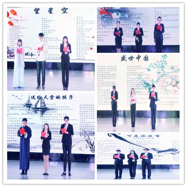 张恒伟、秦丽红、崔争妍以默契的配合朗读了《望星空》,声音悠扬,表达了对理想的执着;汶川地震已经过去了十年,李晨曦、柯瑾钰、张东光用悲凉的声音朗诵的《送给天堂的孩子》仿佛又让同学们再次感受到国殇。
