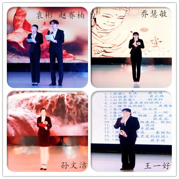 “丁香般的姑娘”、“绝不学痴情的鸟儿”,李晨曦和周洁分别朗读的《雨巷》、《致橡树》,一哀转惆怅,一坚定有力,诠释出对爱情不同的态度;张恒伟、张雅琦精心设计的朗诵——《匆匆》,在移步换位、眼神交流中,感慨了时间的易逝;张东光重新演绎的《沁园春·雪》以饱满的音色、铿锵有力的音调,表达出万丈豪情。