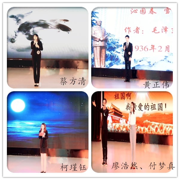 “长太息以掩涕兮,哀民生之多艰。”声音铿锵有力,蔡方清以一首《离骚》拉开了本次比赛的序幕;黄正伟与廖浩然、付梦真分别朗诵的《沁园春·雪》、《祖国啊,我亲爱的祖国》,高昂的音调与低沉的嗓音相结合,令同学们心情激荡;“溶溶的水月螭头上只有她和我”柯瑾钰的《山中杂感》以富有韵律感的语调道来冰心所描述的美景。