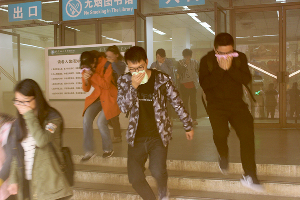16:15分,随着烟雾弹的燃放,警报拉响,200余名师生投入演练。保卫处消防值班员在接到图书馆报警电话后,立即启动应急预案,组织消防队员开消防车、鸣笛警告、手提干粉灭火器赶到现场,跑步进入图书馆内,和图书馆安全管理员一起有组织、有秩序地引导全体学生安全撤离险境,并及时扑灭火险。整个演练过程贴近实战,效果逼真,达到检验预案,快速灭火、快速逃生预期目标。