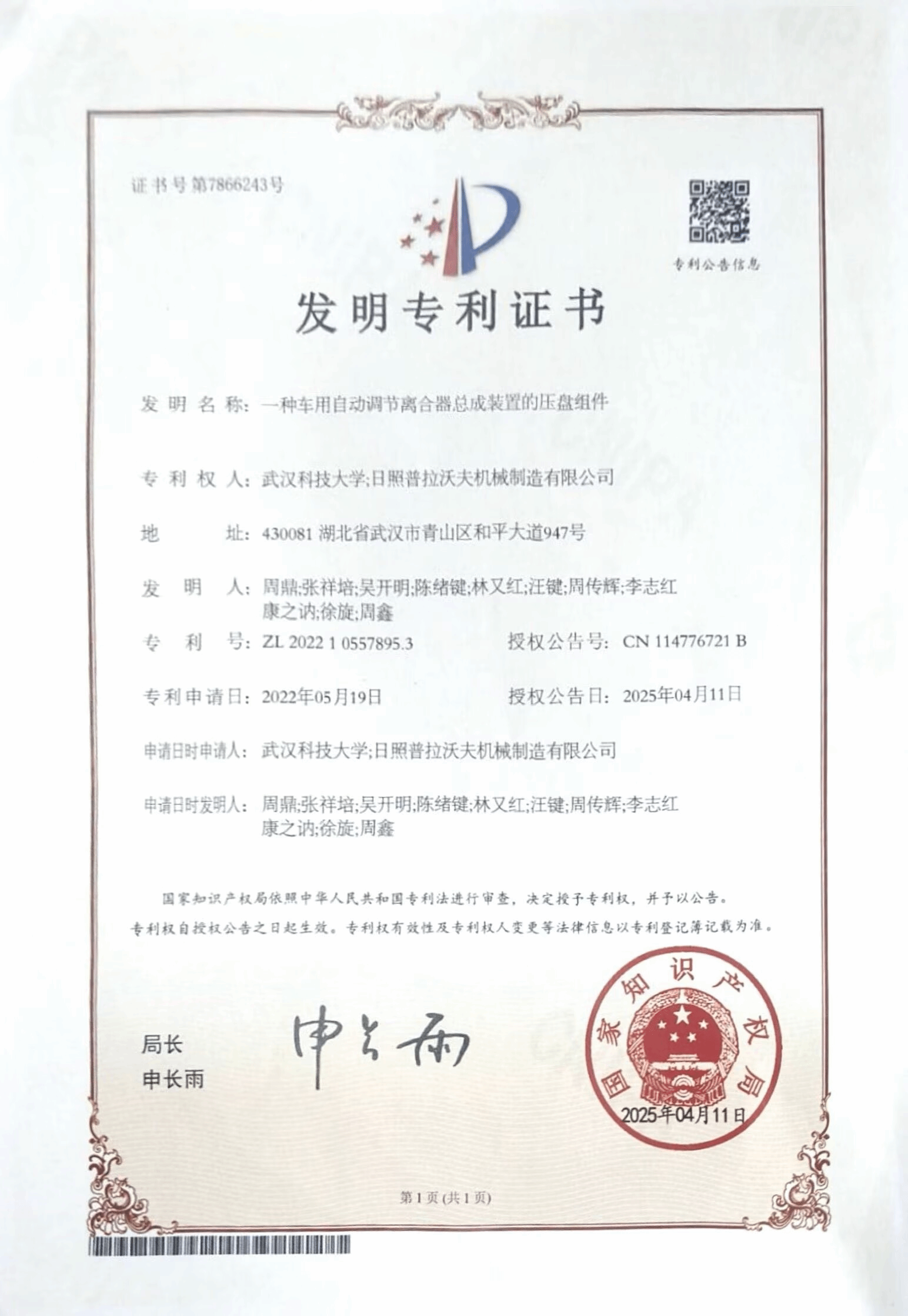 武科大网讯(通讯员余蔓菲) 近日,我校机械学院退休教授周鼎联合吴开明院士团队,与日照普拉沃夫机械制造有限公司开展产学研合作,历时十个月成功研发出新型车用自动调节式离合器。该成果突破了国外厂商在这一领域的核心技术壁垒,填补了国内相关技术空白。目前,该技术已获得实用新型专利和发明专利授权,其第一专利权人为武汉科技大学。