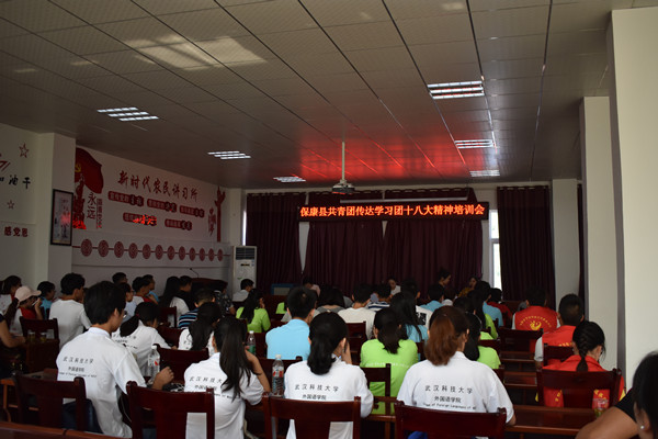 7月16日上午,实践团队前往保康县城关镇三溪沟村委会,参加共青团保康县委传达学习团十八大精神培训会暨保康县2018年“希望家园”启动仪式。保康团县委宦妮娟在会上强调当代青年的历史使命与责任,鼓励青年为实现中华民族伟大复兴不断奋斗。接着,由保康团县委陈怡主持“希望家园”启动仪式。她向听众们介绍了“希望家园”建立的初衷以及发展史,同时,她期望参加“希望家园”活动的志愿者秉承志愿精神,为留守儿童、在外务工子女做好服务。会后,团县委副书记齐雪娇亲切会见了我校团队全体成员,并合影留念。