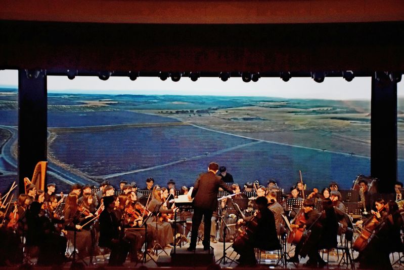 富有中国特色的《红旗颂》拉开了本次汇演的序幕。激昂雄壮的前奏一出场就给人以震撼之感,而后悠扬细腻的旋律配合背景动画的放映,诉说着对祖国的热爱与自豪。时而轻快,时而婉转,爱国主义情怀在中西乐器结合演奏下表达得淋漓尽致。