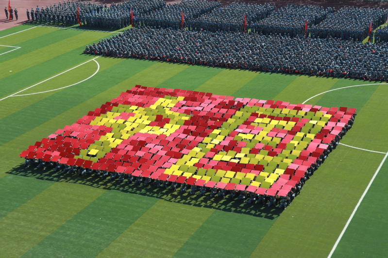 所有阅兵方阵都以良好的姿态,将训练成果展现了出来,而其中花样表演方阵更是夺人眼球、博得全场喝彩。新生们以蹲姿状态手举方形板,随着音乐的节奏和变换不停翻动着,依次摆出了“I”、“爱心”、“中国”等图案。