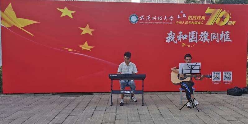 武科大网讯(通讯员方可 黄方鼎)“我和我的祖国,一刻也不能分割…”10月1日,正值国庆,我校千人报告厅前的“我和国旗同框”展板前传来阵阵歌声,原来是交工1903班的李宸翔和伍佳苇为了献礼祖国,正演奏着经典曲目《我和我的祖国》。