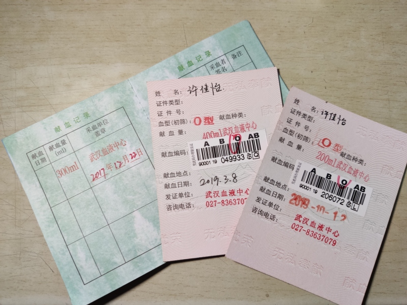 书桌上,整齐摆放的三张红色献血证格外显眼,从2017年至2019年,许佳怡分别献血300、400、200毫升。室友张慧不禁感叹:“三次献血,这次还赶上生日,太有意义了吧!”