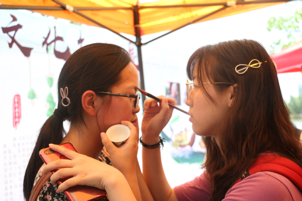 “山黛描眉,朱砂点额”。轻点朱砂,悬臂勾勒,不一会儿一个漂亮的“额间花钿”便在很多女生额上呈现。工程力学1801陶好好在旁讲解道:“点朱砂的颜料是用朱砂和雄黄酒混合制作成的,朱砂本身有辟邪的功能,雄黄祛毒,两者混合在一起,有保平安、驱五毒的意义。”看到女生们额间的朱砂,许多男生也跃跃欲试将朱砂点在手上。