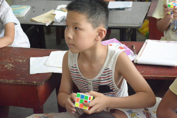 “老师老师,下一步是什么?”有的学生见老师已经被其他问问题的学生围住,不得不挤进去。王国栋好不容易脱身后就到最后一排看学生的进度。“老师你看,这一面我都拼好了。”只见一个学生举着一面一样颜色的魔方向他展示。“有的学生很快就拼好了!”王国栋不禁感叹学生们的吸收能力很快。