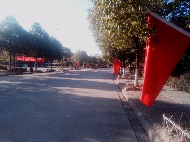 也是在国庆节这一天,一个人走在无比熟悉的大道上,看见宽阔的路两边插满了许多鲜红的五星红旗。和着天空轻轻洒下的光晕,路两边鲜艳的红色显得极为显眼。继续往前走,在望也望不尽的路两边的红旗仿佛数也数不尽。停下来,我轻轻地触摸着它们,我感受到了这些仿佛被鲜血浸染的旗子背后所反映的七十年光辉历程。