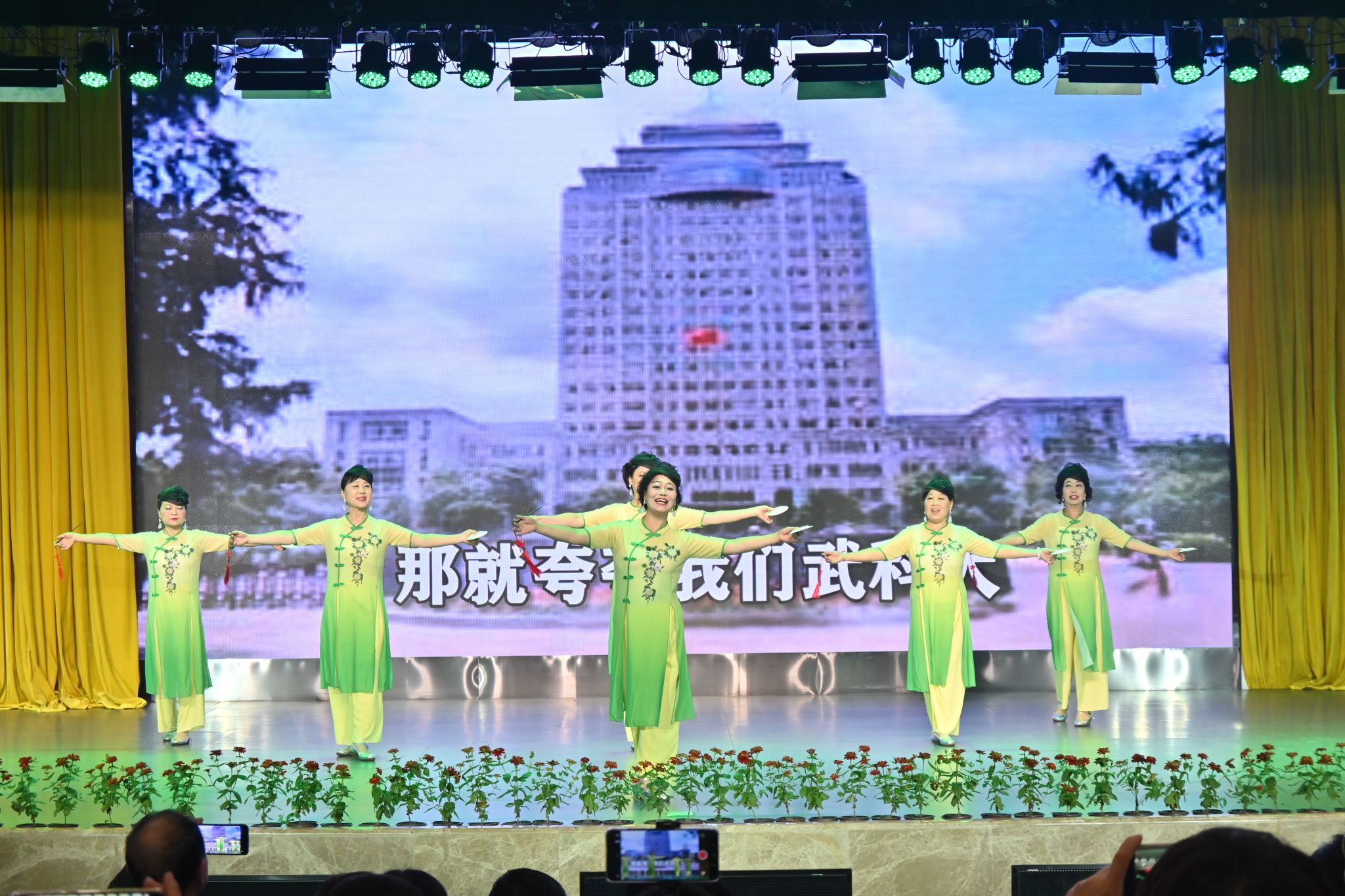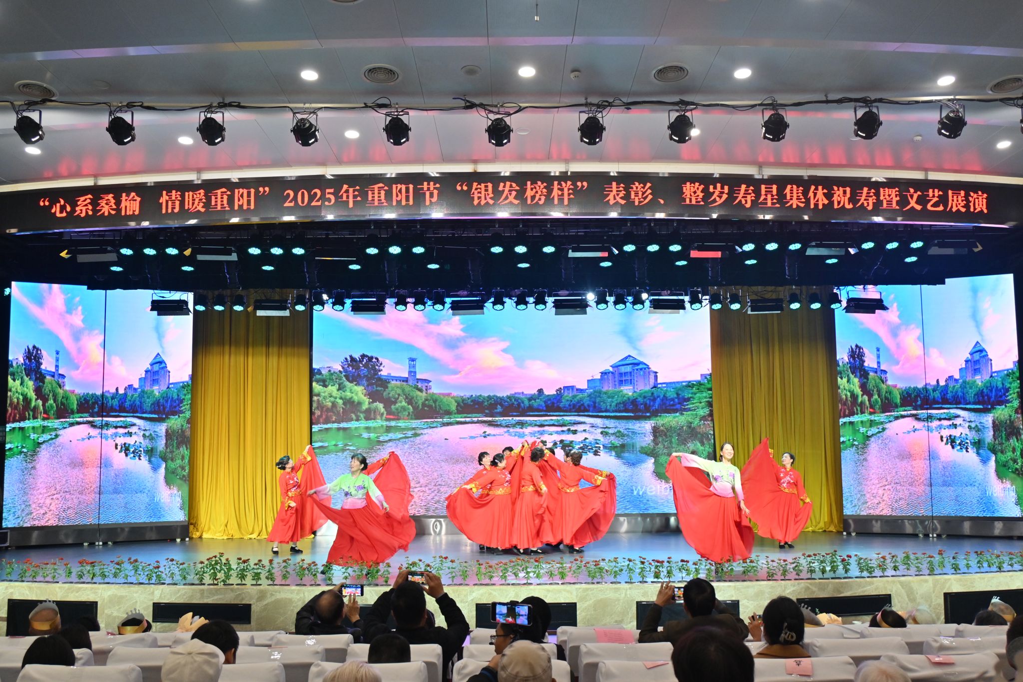 10月28日上午,学校在青山校区碧园会堂举行“银发榜样”表彰仪式暨重阳节集体祝寿活动,现场表彰首届“银发榜样”离退休教职工先进集体、个人,校领导为整岁寿星祝寿。文艺展演环节,京剧表演、湖北小板、时装秀等表演丰富多样、精彩纷呈。
