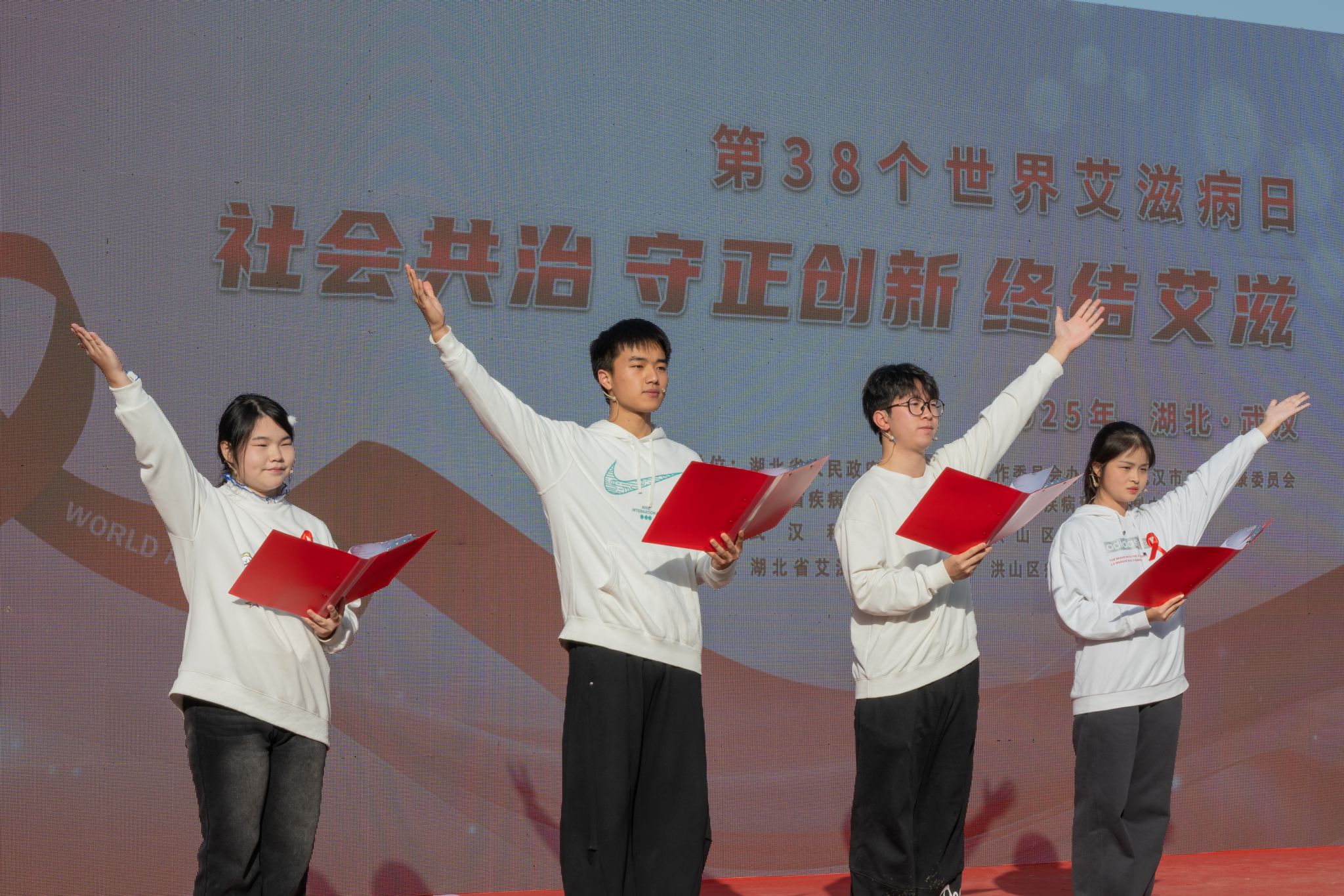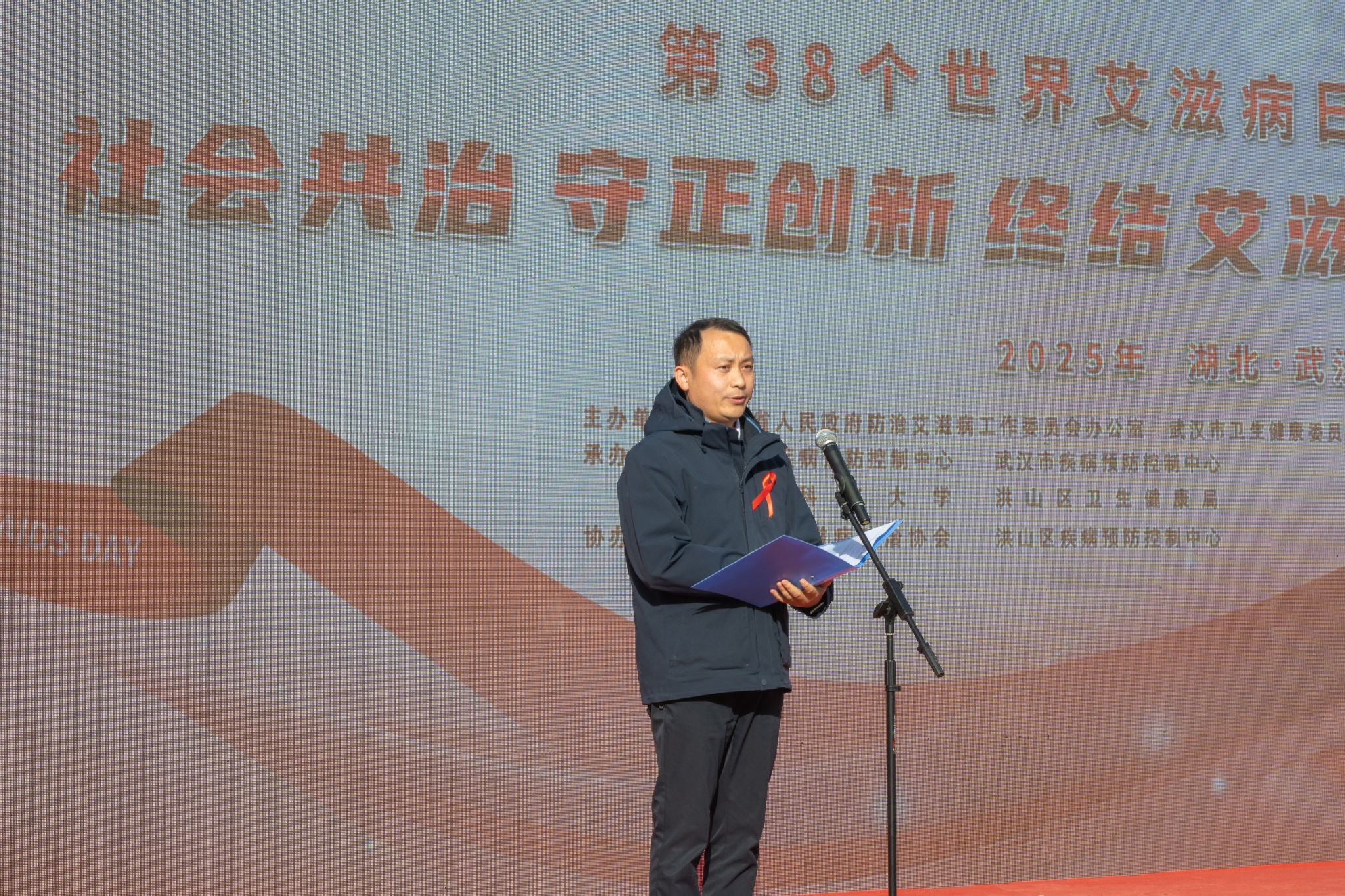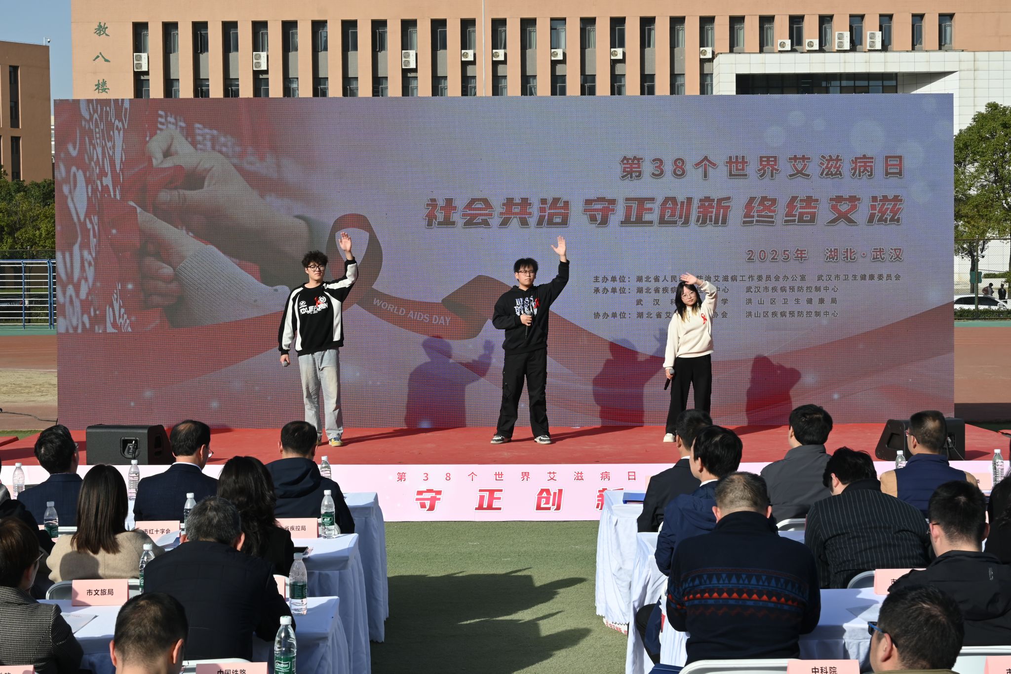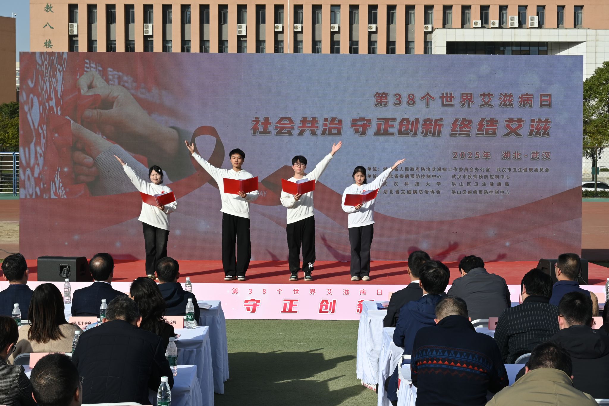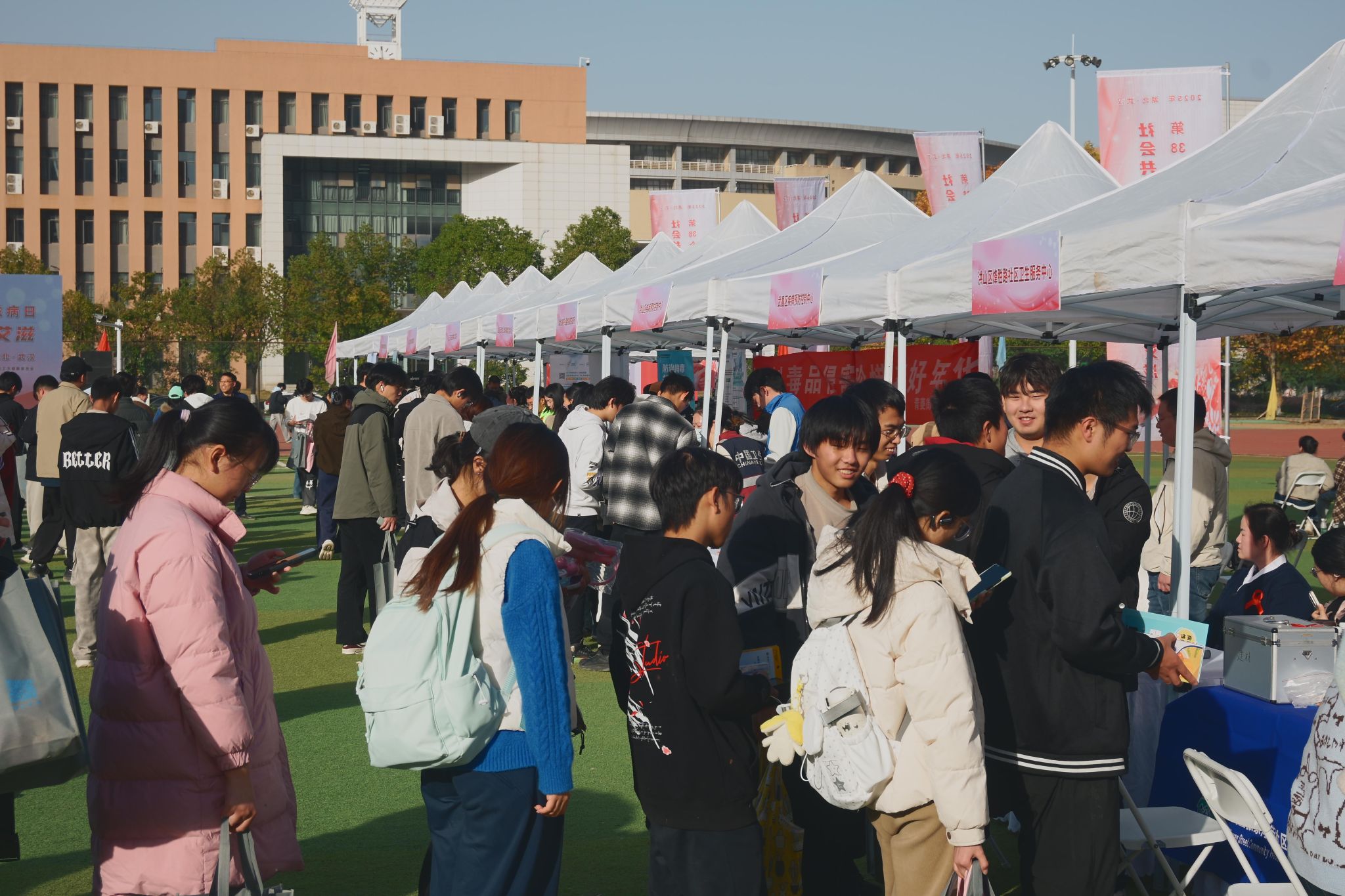 11月27日,湖北省第 38 个“世界艾滋病日”主题宣传活动在我校黄家湖校区南区体育场举办。我校、市卫健委、省政府防艾办和其他相关单位负责人参加启动仪式。启动仪式后,高校学生代表宣读倡议书,团省委、团市委为志愿者授旗。湖北省疾病预防控制中心等单位、企业在现场搭建展台,为师生们答疑解惑、提供健康建议。(孙正恒)