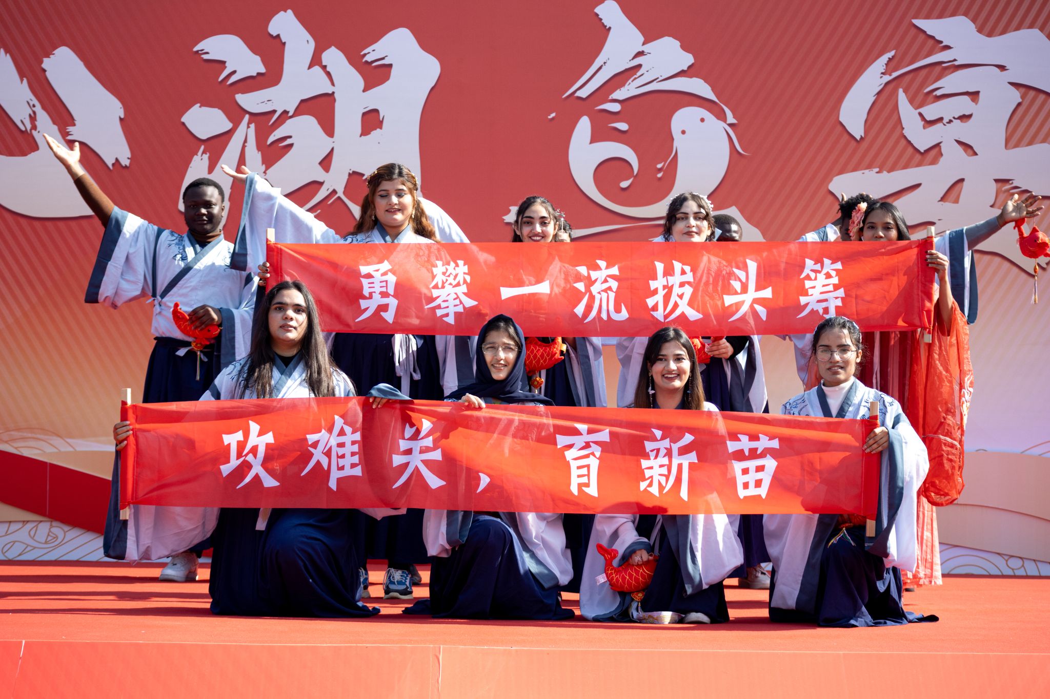 “一二一,加把劲!”晨光熹微,沁湖岸边已是热火朝天。拉网号子铿锵有力,响彻云霄。百余名中外学子组成的捕鱼突击队紧握网纲,协力收网。经过一小时的鏖战,巨大的渔网缓缓收拢,万千鱼儿在水中翻腾跳跃,平静的湖面瞬间沸腾,岸上围观师生的欢呼声此起彼伏,共同见证了这一激动人心的丰收时刻。