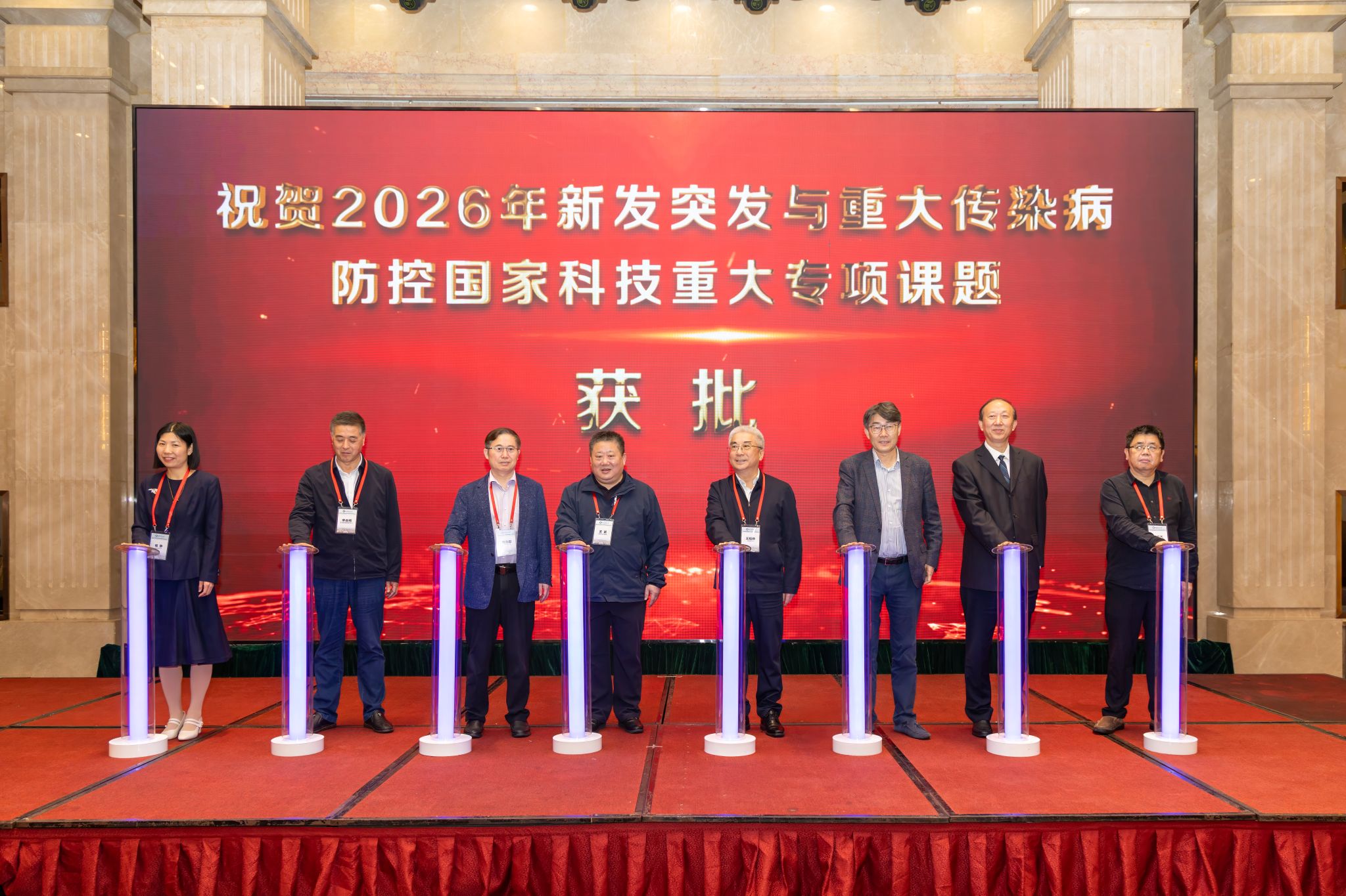 以研究院揭牌为契机,一项由中国疾病预防控制中心病毒病预防控制所牵头、联合我校等5家单位申报的2026年国家科技重大专项“具有传播风险的病原流行特征和防控策略研究”项目正式启动。程静教授牵头负责该项目课题3——“猴痘等重要传染病区域人群免疫本底及易感或重症化机制研究”。该课题获批国拨经费500万元,实现了我校公共卫生领域国家科技重大专项“零的突破”。随后,高福院士、王焰新院士与程静教授等共同启动了该国家科技重大专项课题。