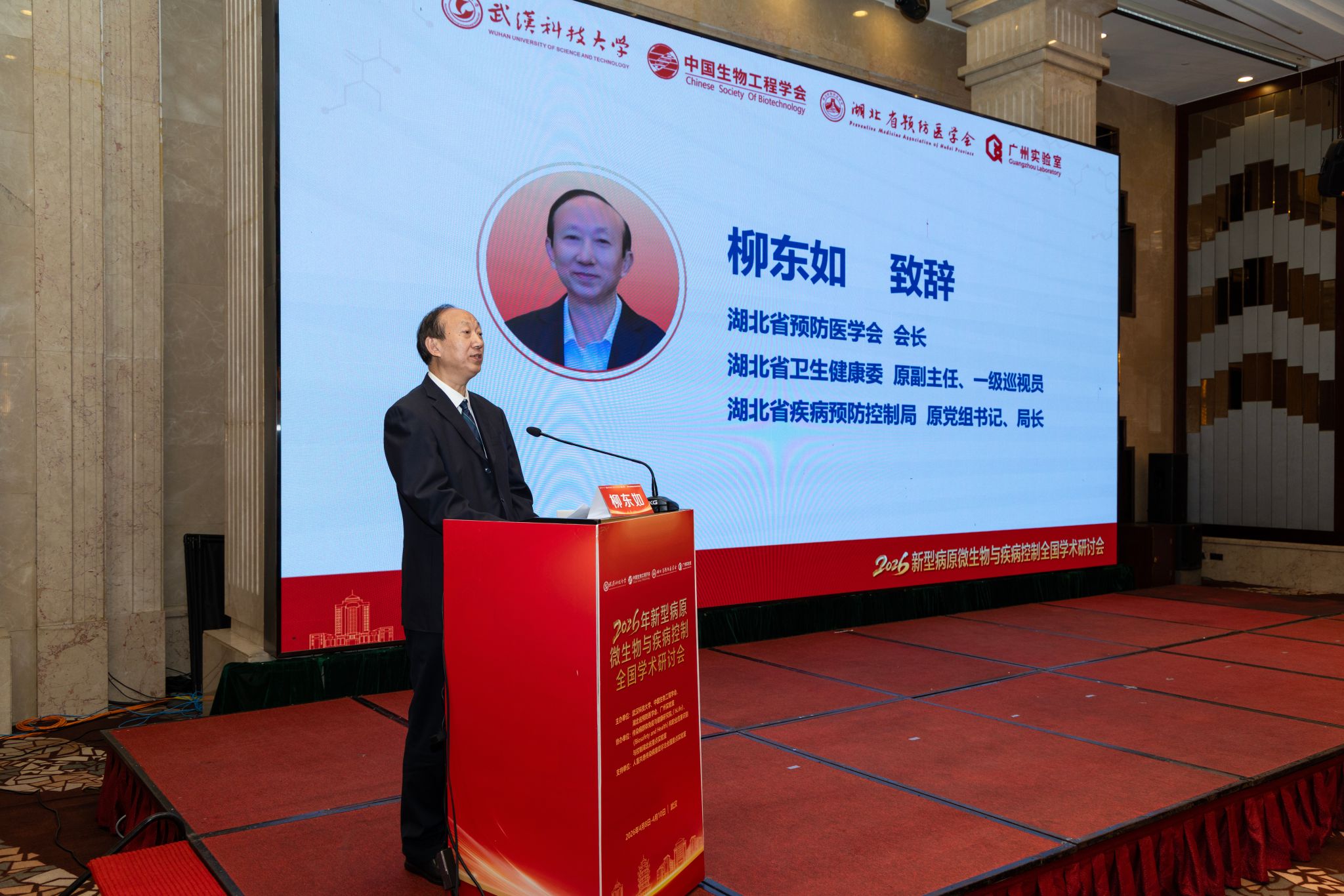 柳东如在致辞中充分肯定了我校在传染病监测预警等方面的扎实基础。他表示,本次研讨会聚焦病原鉴定、检测技术等前沿方向,意义深远,期待学校在服务湖北加快建成战略支点中多挑重担、多出成果。