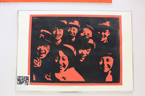致辞结束后,盛建龙宣布艺术展开幕。到场的各位嘉宾、学生在讲解员的介绍下参观展览。在“伟大历程篇”中,讲解员重点向各位领导介绍了张文畅的作品《赢》与彭全圆的《飞夺泸定桥》。《赢》以解放军高级将领张爱萍的照片为蓝本,用版画的形式加工,展现了抗战时热情奔放的新四军年轻战士对赢得胜利的信心;怀着浪漫主义情怀创作的作品《飞夺泸定桥》以“星空”为灵感,红色为主色,寄托了对先辈的感恩和对未来的憧憬。