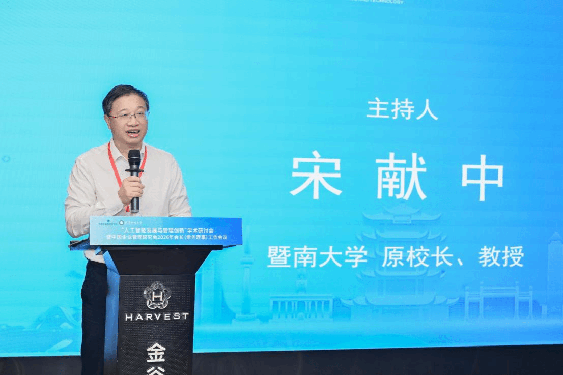 开幕式由暨南大学原校长、教授宋献中主持,他指出了人工智能重塑管理学理论与实践的时代命题。