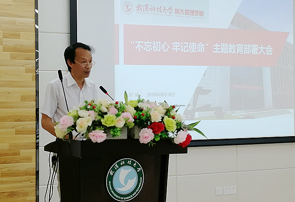孙国胜在主题教育部署大会上讲话。他强调,开展“不忘初心、牢记使命”主题教育,就是要教育引导全校党员干部牢固树立为党育人、为国育才的初心使命,着力培养德智体美劳全面发展的社会主义建设者和接班人;着力研究解决学校改革发展中的突出问题,加快推进一流大学和一流学科建设;着力提高科学研究水平,增强服务社会、服务湖北高质量发展的能力,扎根中国大地办好中国特色社会主义大学。他对恒大管理学院开展“不忘初心、牢记使命”主题教育提出三点要求:一要提高政治站位,深刻领会开展“不忘初心、牢记使命”主题教育的重大意义;二要坚持善作善成,统筹落实主题教育各项任务,增强主题教育的针对性和实效性;三要精心安排组织实施,确保主题教育取得实效。他希望恒大管理学院各级党组织和党员坚持以习近平新时代中国特色社会主义思想为指导,真正把不忘初心的标尺立起来,把牢记使命的责任扛起来,把党员的先锋形象彰显出来,把党组织的战斗堡垒作用发挥出来,凝聚起奋进新时代的磅礴力量,奋力谱写新时代学院高质量发展的新篇章,以优异成绩向新中国成立70周年献礼。