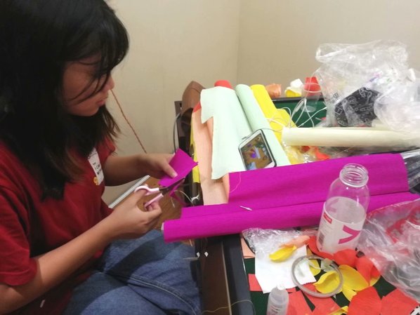 分好组后,周露和范心怡开始分发制作材料,孩子们已经迫不及待的想要开始制作。三位志愿者开始在六个小组中轮流辅导。胡雨洁看到一个小朋友正手忙脚乱地剪贴花瓣,进度明显比其他人慢。“可以先将花瓣的形状一起画在纸上,再画里面的花蕊。”她过去指导道,并帮小朋友剪下叶萼部分。小朋友高兴地回应给她一个微笑。