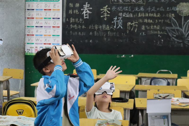 当队员们拿着VR眼镜走进教室时,便有不少孩子好奇地围上前来询问。“大家知道这是什么吗?”胡可杰问道,平时对科技了解比较多的高年级学生立马喊出了答案。一段用VR技术玩游戏、登雪山的视频吸引了孩子们的注意力。在胡可杰为同学们介绍了VR多感知性、自主性、存在性等特征后便进入了体验环节。