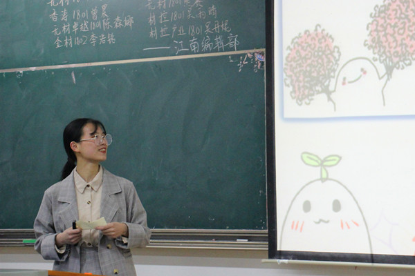 来自无材卓越1801班的宣传委员陈森娜也分享了班级同学们的朋友圈,但与众不同的是,她的PPT背景全部由自己绘制,PPT的下方是她为班级官Q和官博设计的吉祥物——壹壹和越壹。而上方则根据每位同学的特点创作了造型为“团子”的简笔画。这些团子形态各异,有的戴着眼镜,有的留着齐刘海,还有的留着长发,生动有趣的简笔画让观众能立刻联想到朋友圈动态背后的主人的模样。不同于其他分享自己朋友圈的参赛选手,材化1801班的彭博文另辟蹊径地讲述了通过朋友圈得到的反思,他借用汪涵在《火星情报局》中所讲的:“当你朋友圈的人过多的时候,你放在每个人身上的注意力会更分散。不如去繁从简,留下那些对你重要的,常交流。”告诉了大家“时间有限,请不要为杂物而活”的深刻道理。