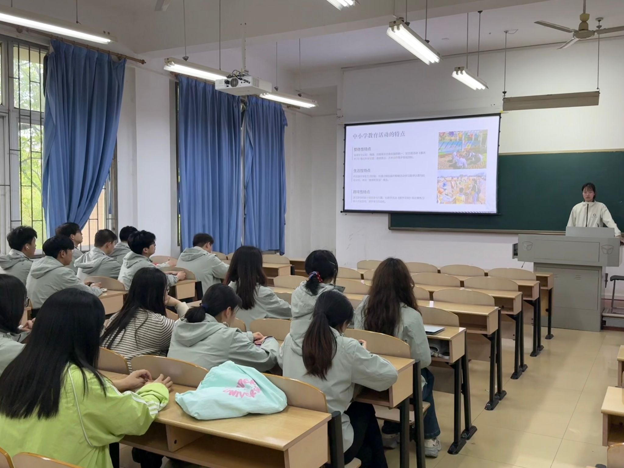 在理论讲解环节,陈娴敏明确了中小学教育活动是教师有目的、有计划引导学生生动、活泼、主动参与的教育过程,包含教师主导、学生主体、形式多样、过程教育四层要义。结合《春天来了》主题活动、模拟超市购物、数字寻宝游戏等真实案例,她重点阐释了教育活动的整体性、生活性、趣味性三大特点,让抽象理论更贴近中小学课堂实际。