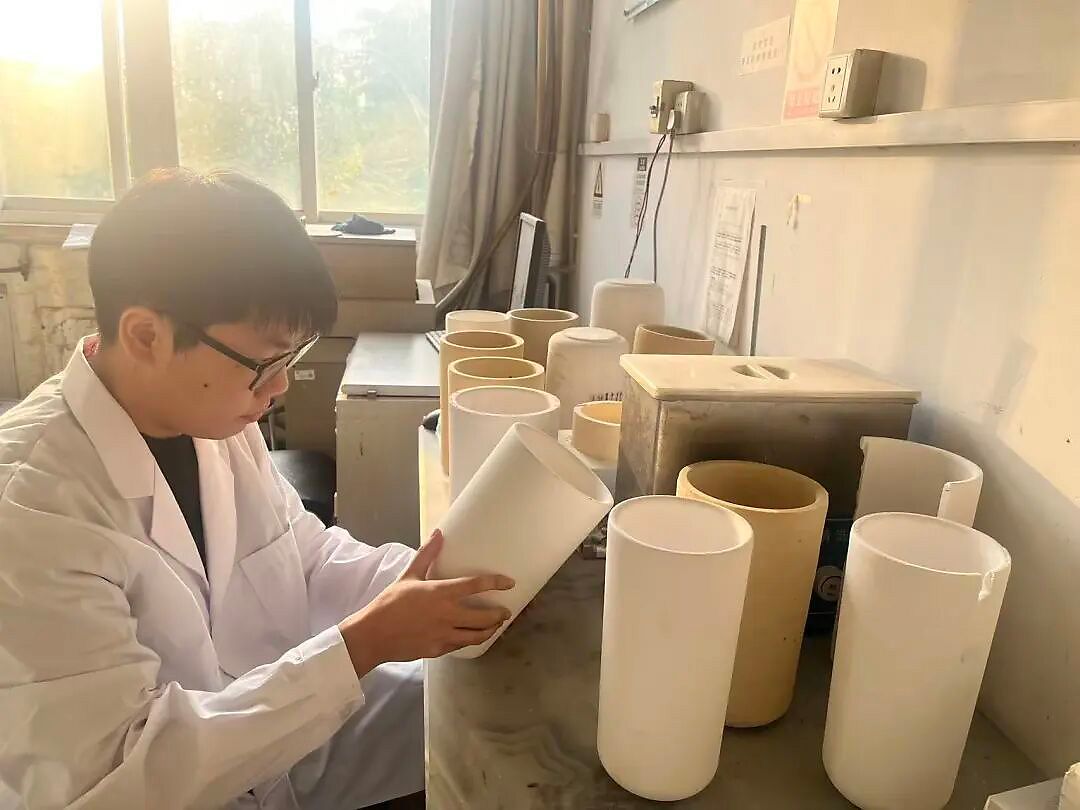 “材料离人最近,能亲眼看到自己的成果投入应用,这让我非常兴奋。”凭借这份专注和韧劲,蔡震度过了一个个实验室的夜晚,迎来了企业的“试炼”。他带着自制的100公斤级坩埚驱车数百公里赴企业测试,却遭遇烘炉后坩埚全部开裂的困境。这令他沮丧不已,但他很快振作,连夜拆解问题、反复实验,最终发现是企业自备的打炉料热膨胀系数与坩埚不匹配所致,随即开发出配套的打炉料及操作标准,解决了成果转化的关键难题。