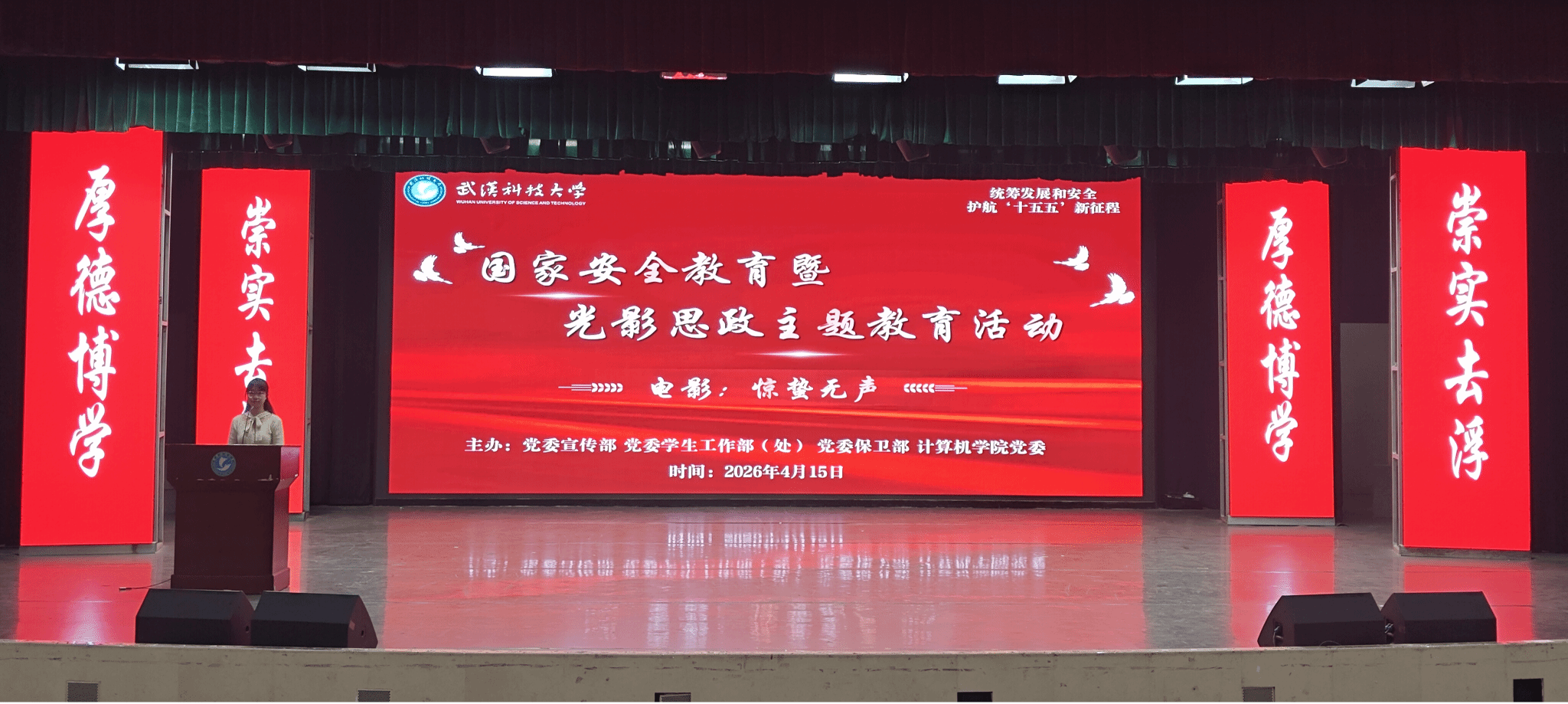 武科大网讯(通讯员肖卓灵 万杰斌)“统筹发展和安全,护航‘十五五’新征程”。4月15日晚,武汉科技大学国家安全教育暨光影思政主题教育活动在黄家湖校区沁湖礼堂举行。各学院近500名师生代表共同观看当代国安题材影片《惊蛰无声》。活动由党委宣传部、党委学生工作部、党委保卫部、计算机科学与技术学院党委联合主办。
