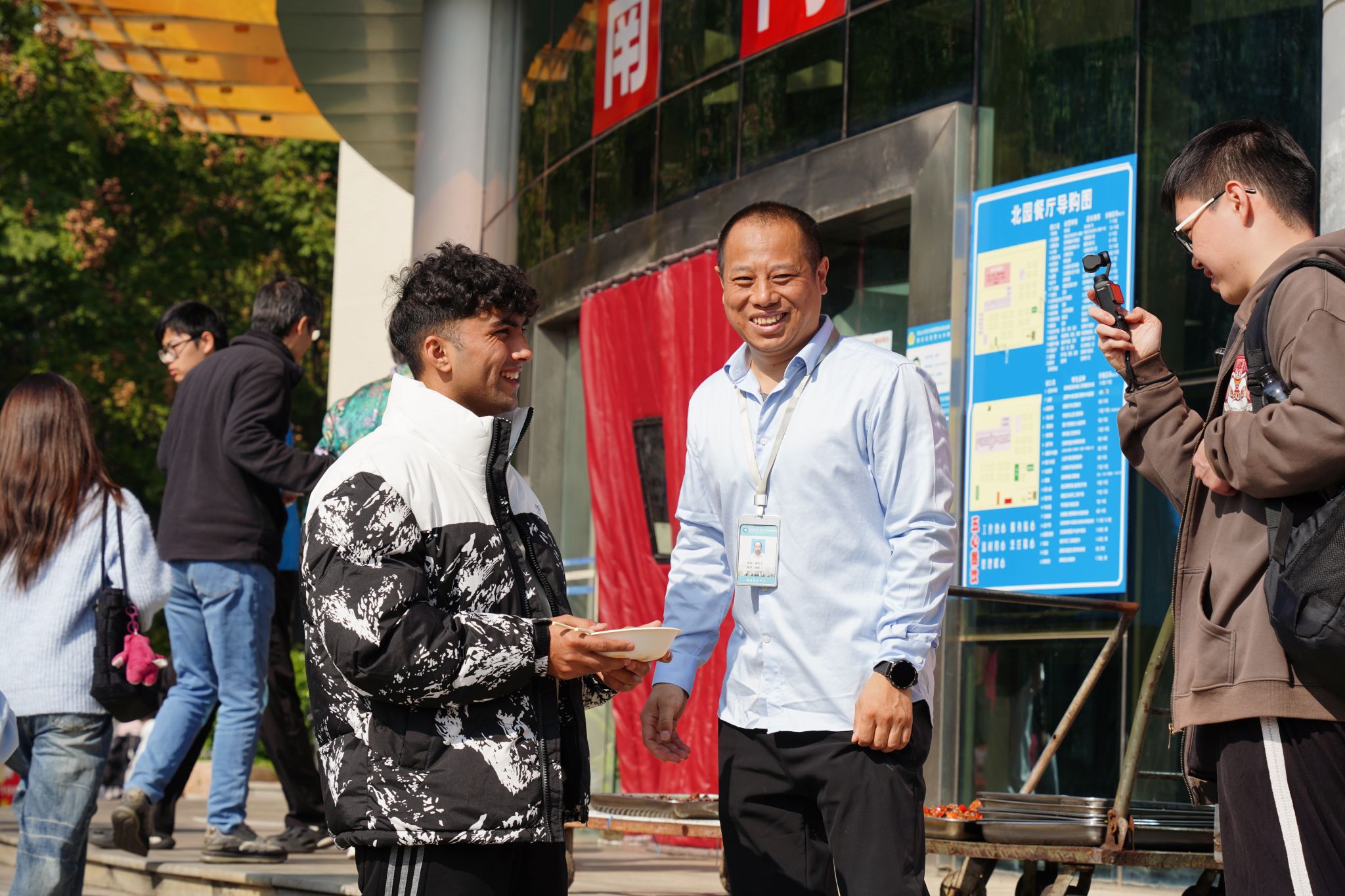 留学生、食堂负责人接受采访